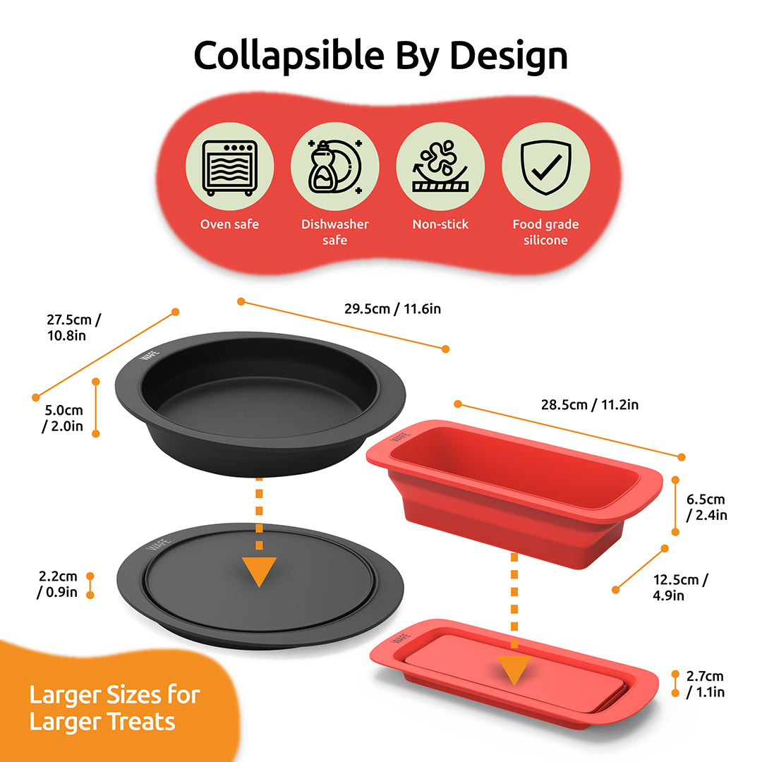 VERSATILE 2-PACK - Not just for cakes, this adaptable tool is also perfect for a variety of baking needs. Whether it's baking a round cake or crafting delicious dishes like deep-dish pizzas or layered tortes, it provides excellent results every time; Includes a silicone loaf tin for bread and a round cake tin