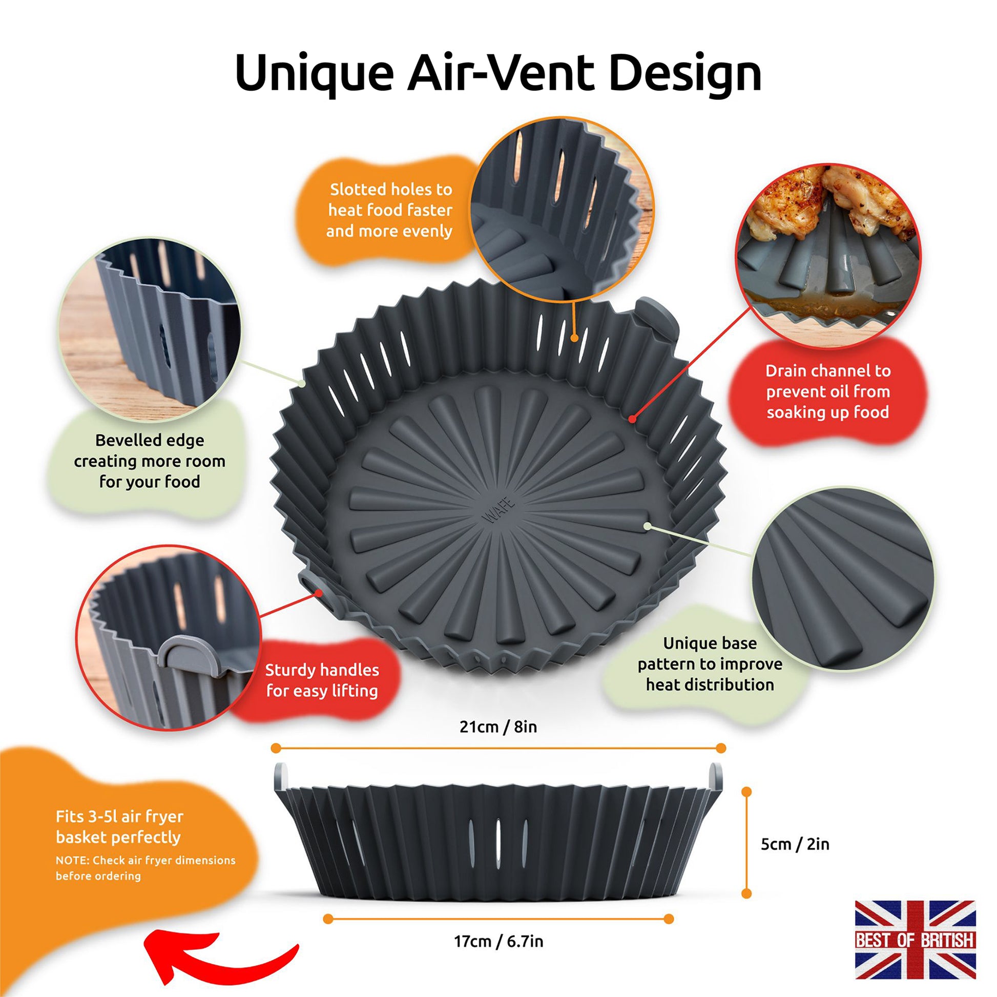 👨🍳 EFFICIENTLY COOKS FOOD - WAFE liners enables fast and even cooking because of the slotted holes and our carefully designed 360° air flow structure. A drain channel keeps oil from soaking food, while bevelled edges allow for more space for ingredients